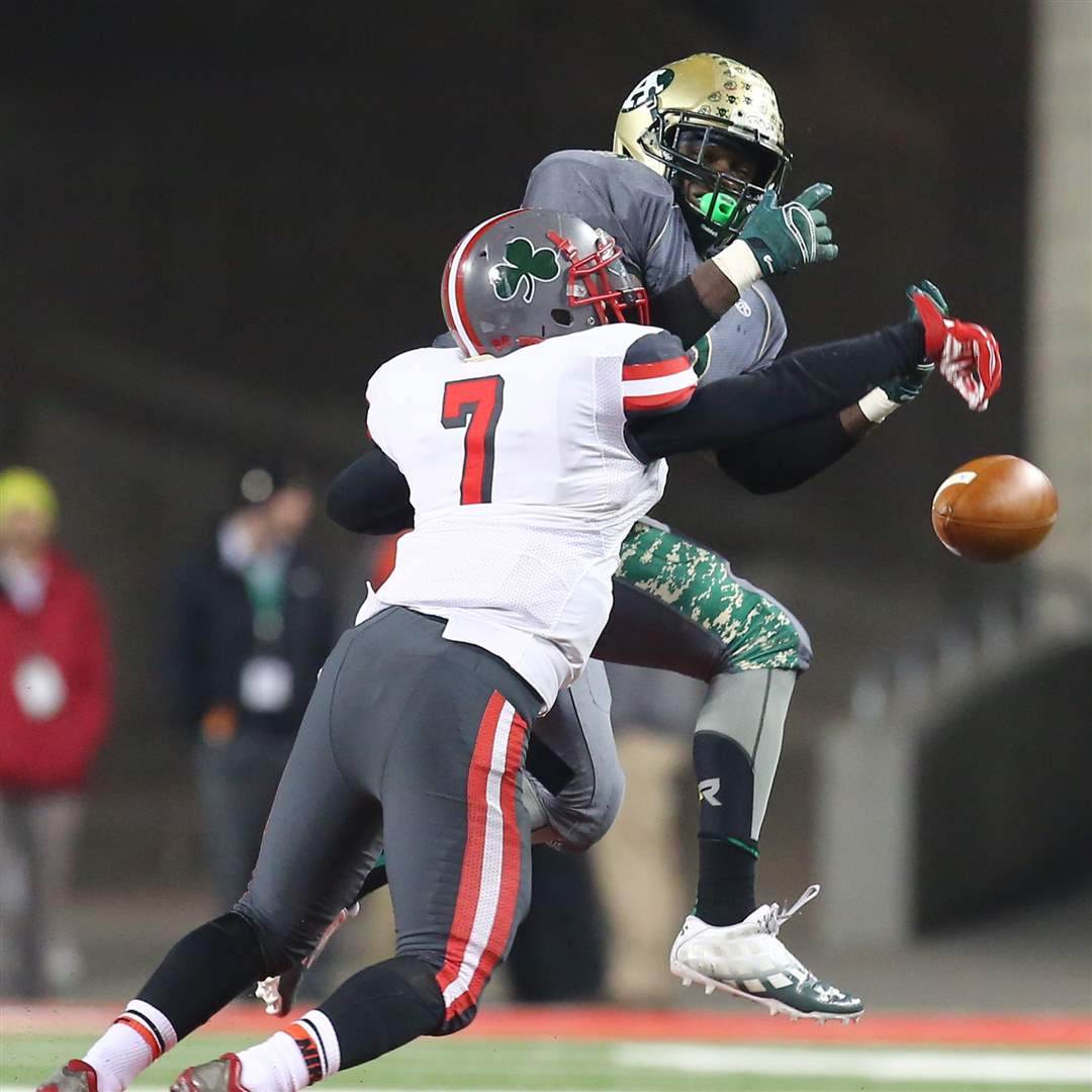 Central Catholic DB Stephon Campbell (7) breaks up a pass intended for Athens TB Trae Williams (3).