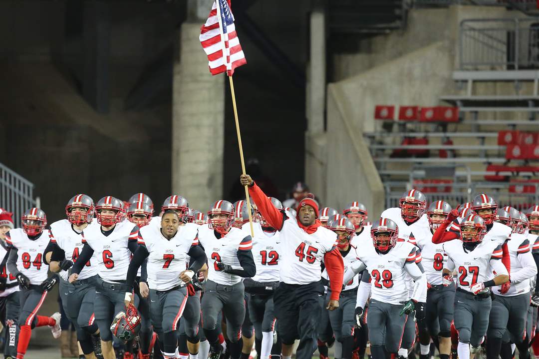Central Catholic takes the field against Athens during the Division III state football championship in Columbus.