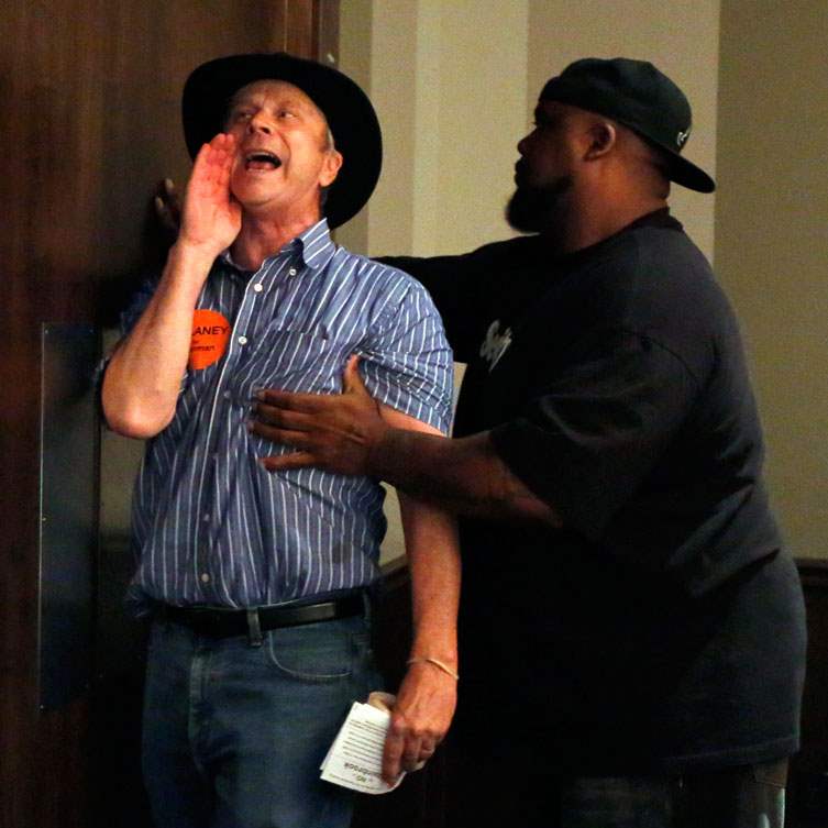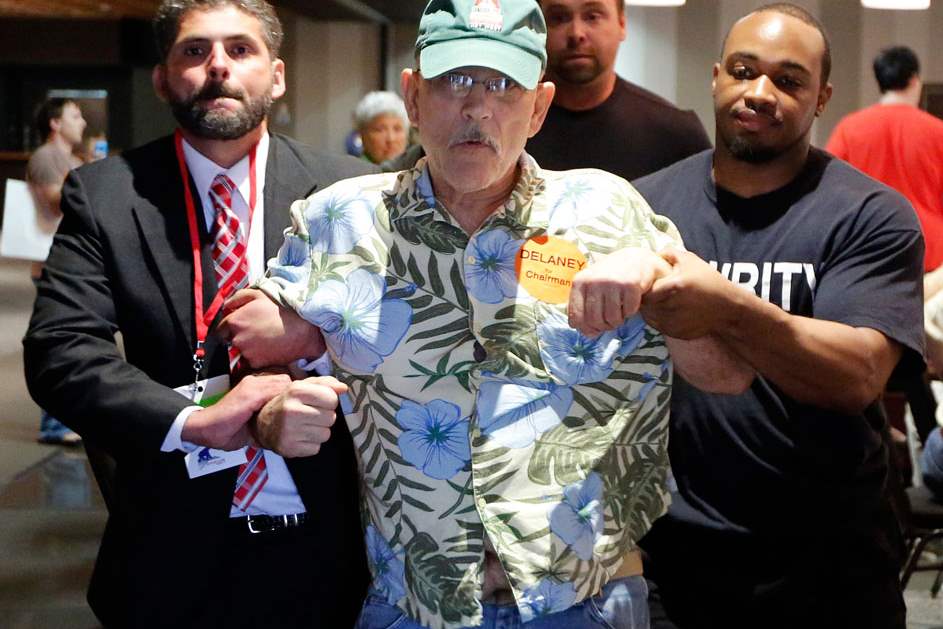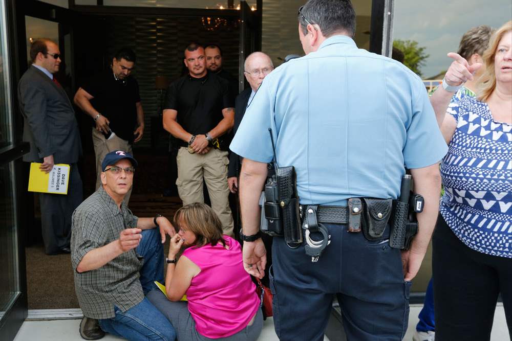 Dennis Lange argues with security before being thrown out of the Lucas County Republican Party Central Committee meeting.