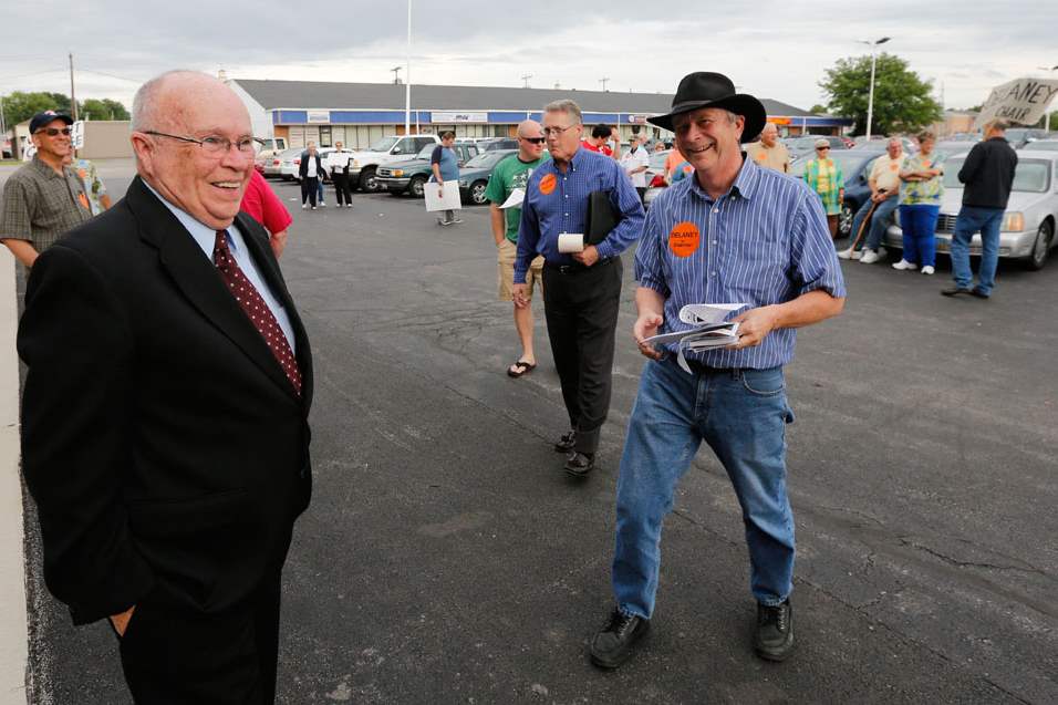 Bill Delaney, candidate for chairman of the Lucas County Republican Party, talks with John McAvoy.