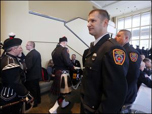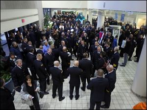 Firefighters and their families fill the lobby of the SeaGate Convention Center in Toledo before the doors open for the Last Alarm funeral service.