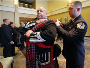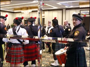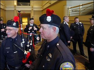 Marcus Sautter, right, with the Sylvania Township Fire Department, watches as members of pipes and drum corps make their way to the SeaGate Convention Centre.