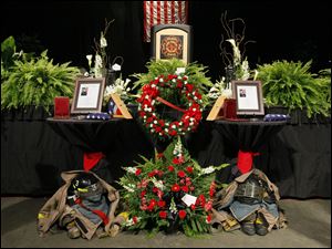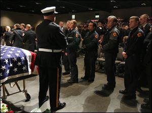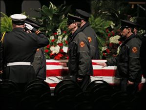 The casket of Toledo firefighter Stephen A. Machcinski is carried into the SeaGate Convention Centre.