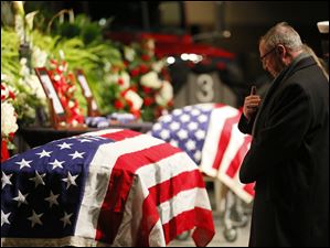 Toledo firefighters pause before the casket of firefighter James Dickman.