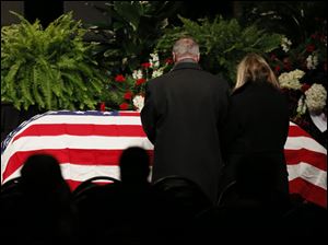 Toledo Mayor D. Michael Collins and his wife Sandra Drabik pause in front of the casket of Stephen Machcinski.