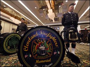 Fred Kartune, with the The Cleveland Firefighters Memorial Pipes and Drums, waits with his drum with other national members of the Pipes and Drum Corps before playing at the Last Alarm service for firefighters Stephen Machcinski and James Dickman,who were killed in the line of duty on Sunday.
