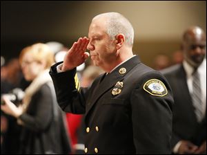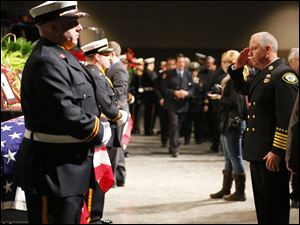 Toledo Fire Chief Luis Santiago salutes the casket of firefighter James Dickman during the Last Alarm funeral service.