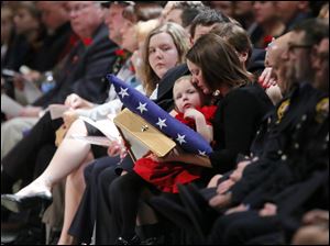 Paige Dickman, 3, daughter of Toledo firefighter James Dickman, holds an Ohio flag while sitting on the lap of her mother Jamie, wife of Mr. Dickman.