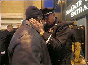 Lieutenant/Paramedic George Simko, right, with the Toledo Fire and Rescue Department, and retired Toledo Fire Lt. Kevin Goolsby embrace outside of the Seagate Convention Centre.