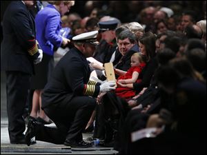 U.S Rep. Marcy Kaptur, left, and U.S. Sen. Sherrod Brown present the American flag to the family of Toledo firefighter Stephen A. Machinski.