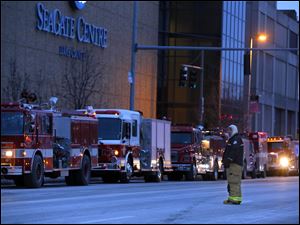 Springfield Fire Captain Mike Kokocinski directs traffic outside of the Seagate Convention Centre.