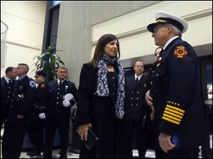 Retired Toledo Fire Chief Mike Wolever, right, speaks with Beth Metzger, wife of Redondo Beach Fire Chief Robert Metzger, who was a former deputy chief in Toledo.