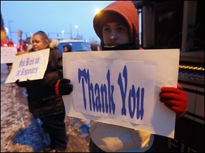 Retired Toledo Fire Battalion Chief Bill Sulewski, left, shakes hands with Andy Ruiz, who holds a sign with condolences.