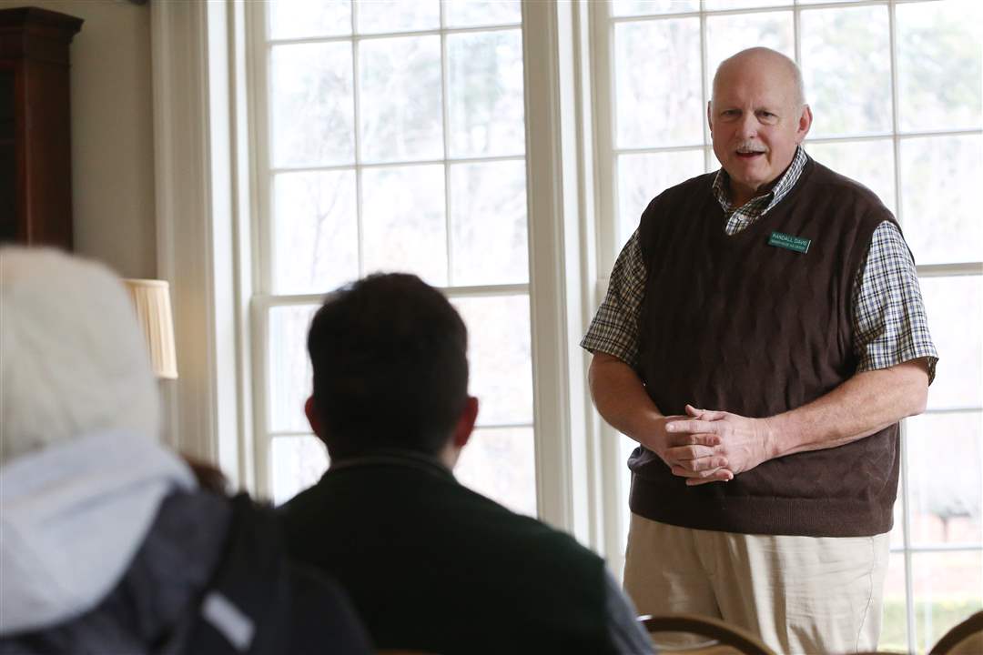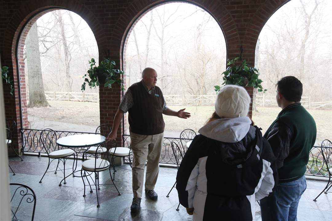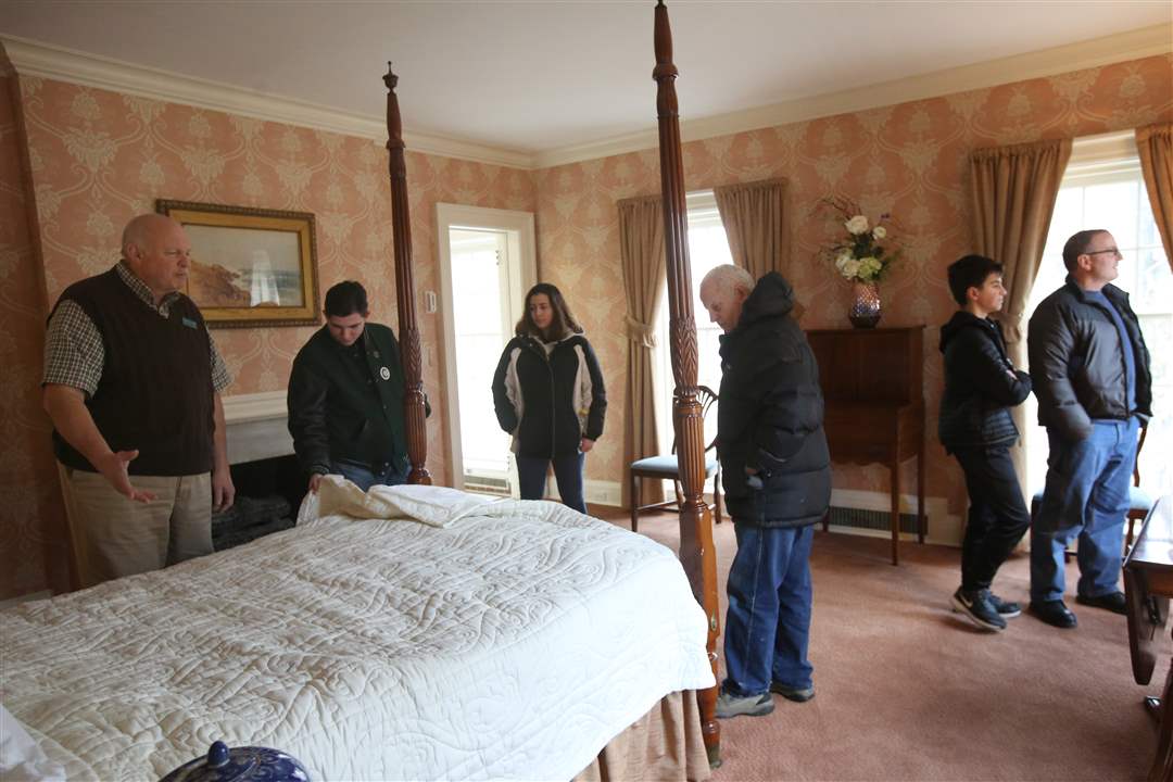 Volunteer docent Randy Davis, left, leads a tour of, from left, Marcus Santoni, Khala Gilliam, Bob Osborn, 82, Sean Osborn, 13, and Brian Osborn through the master bedroom suite at the Manor House at Wildwood Preserve.