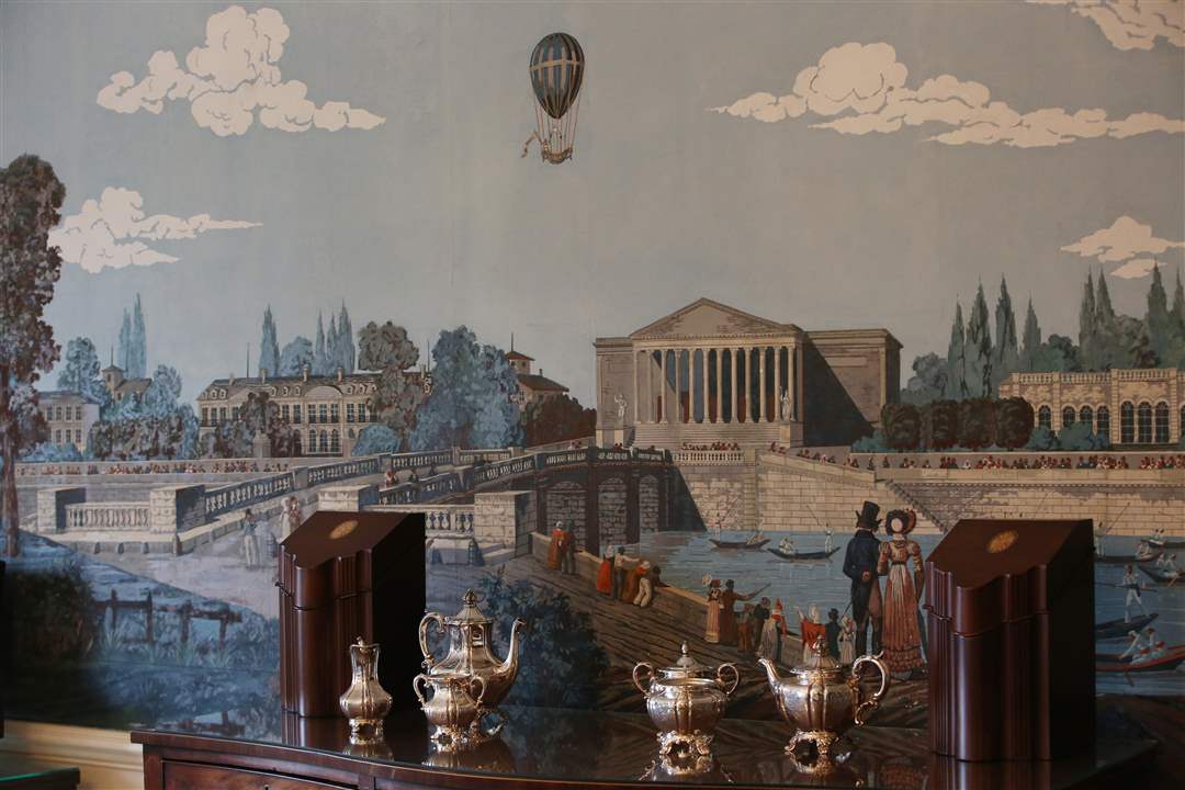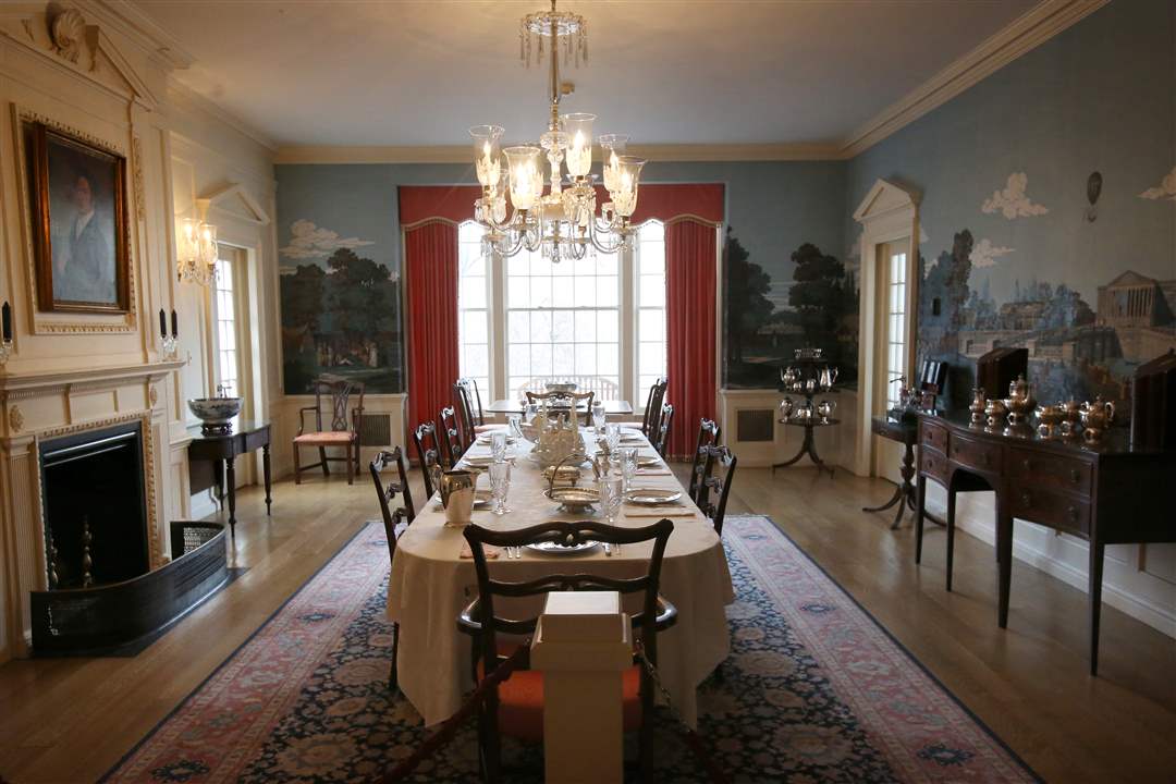 French wallpaper known to be more than 250 years old was imported for the dining room when the Manor House was built by the co-founder of Champion Spark Plug Company Robert A. Stranahan and his wife Page.