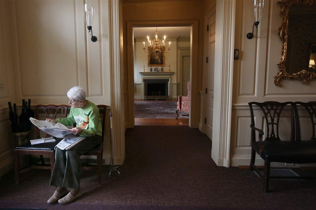 Long-time volunteer docent Janice Emmitt reads the paper as she waits to greet visitors at the Manor House at Wildwood Preserve.