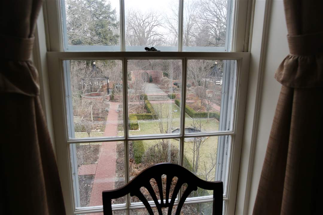 A view of the gardens is offered from a window inside the master bedroom at the Manor House.