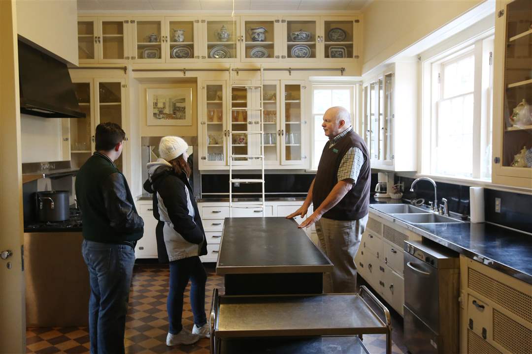 Visitors Marcus Santoni of Macedonia, Ohio, from left, and Khala Gilliam of South Toledo, listen as volunteer docent Randy Davis, right, describes the functions of the historic serving kitchen during a tour of Manor House.