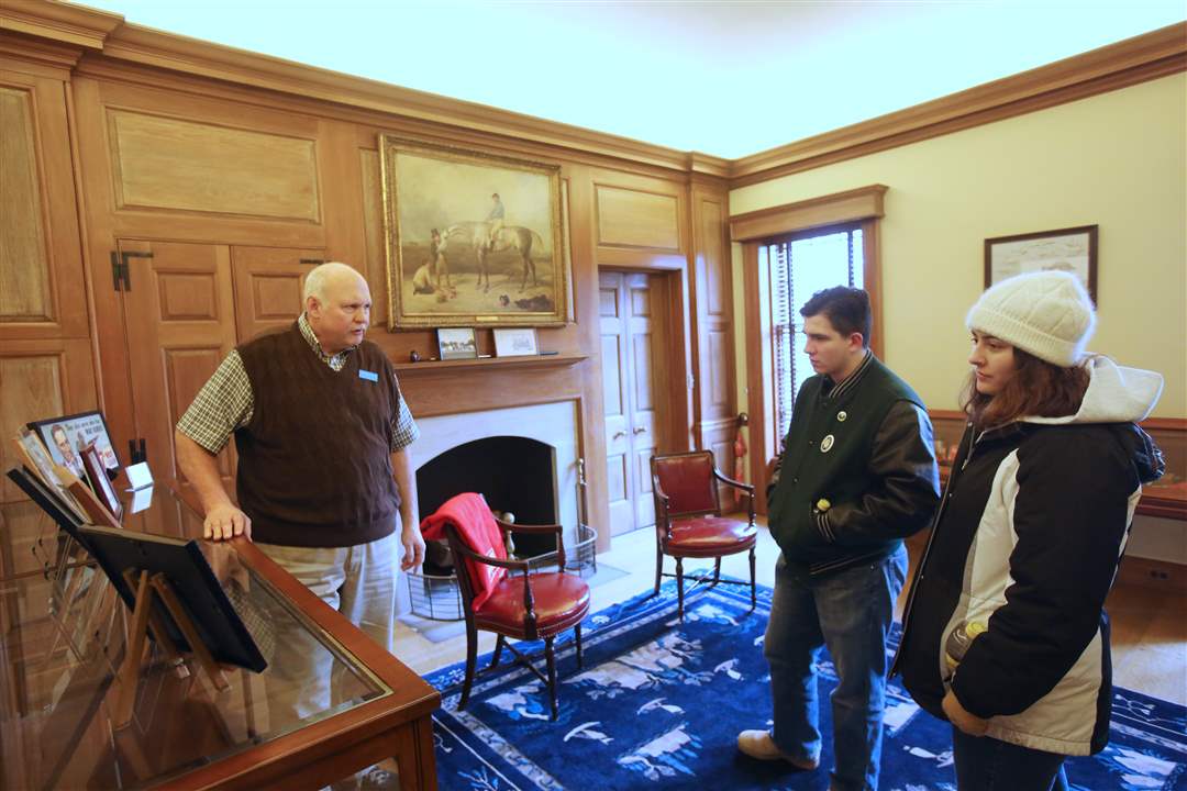 Volunteer docent Randy Davis, from left, shows Stranahan memorabilia to visitors Marcus Santoni of Macedonia, Ohio, and Khala Gilliam of South Toledo.