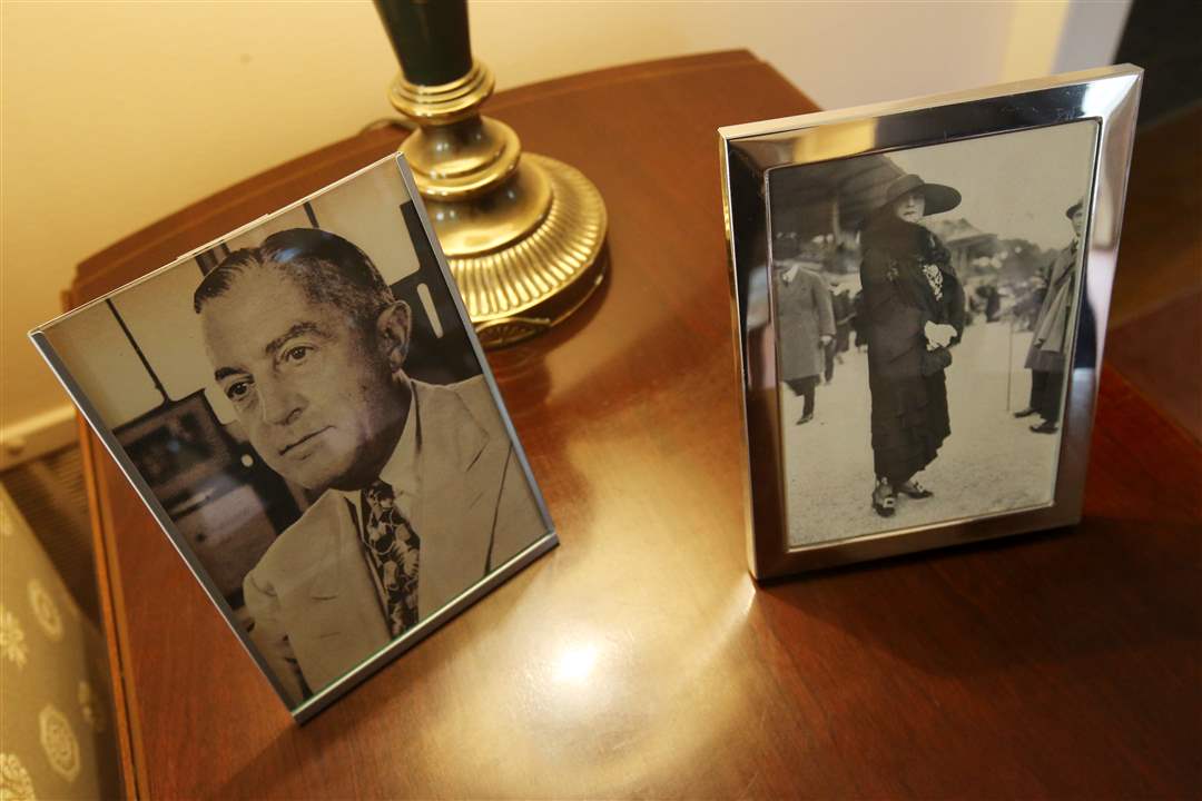 Photographs of co-founder of Champion Spark Plug Company Robert A. Stranahan, left, and his wife Page sit on a table in the suite that was once theirs in the Manor House at Wildwood Preserve.