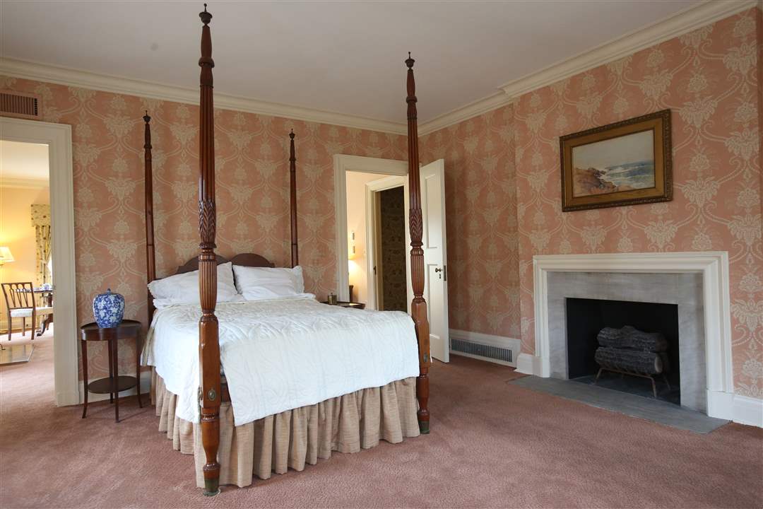 The master bedroom suite, pictured, at the historic Manor House at Wildwood Preserve.