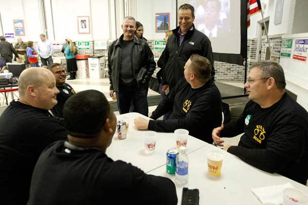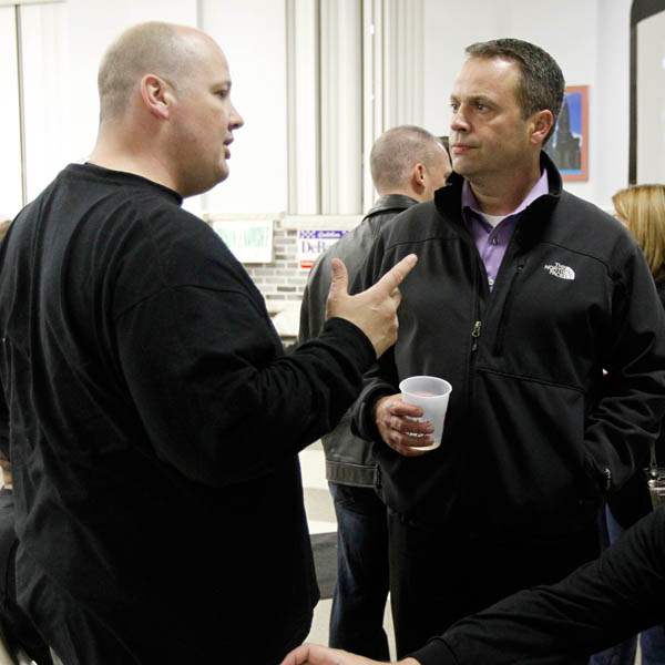 Former Mayor Carty Finkbeiner, right, speaks to Democratic Party Executive Committee member Mike Friedman, left, during the D. Michael Collins election viewing party at the Teamster's Local 20 Hall.