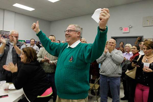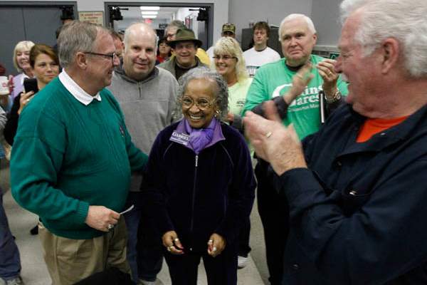 Volunteers and supporters Rocleen Giovannucci Reihing, left, Harold Hill, center, and Elaine Hill, right, celebrate the first returns.