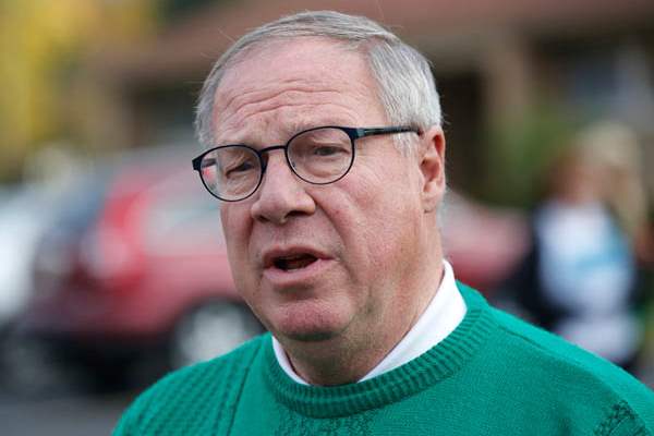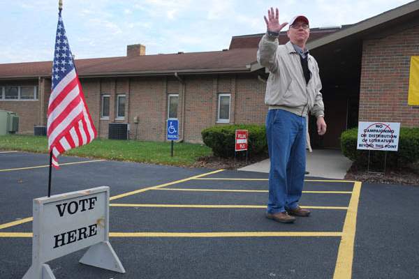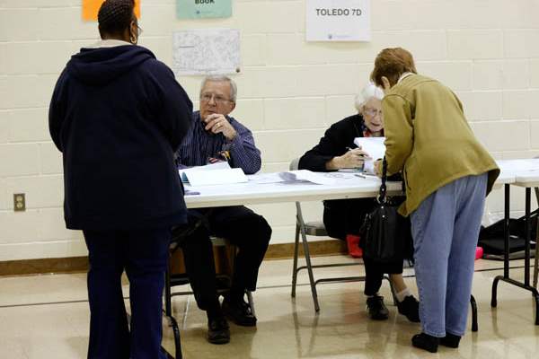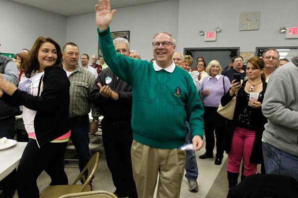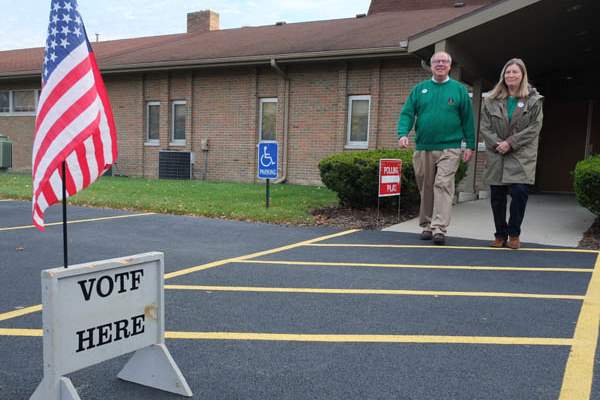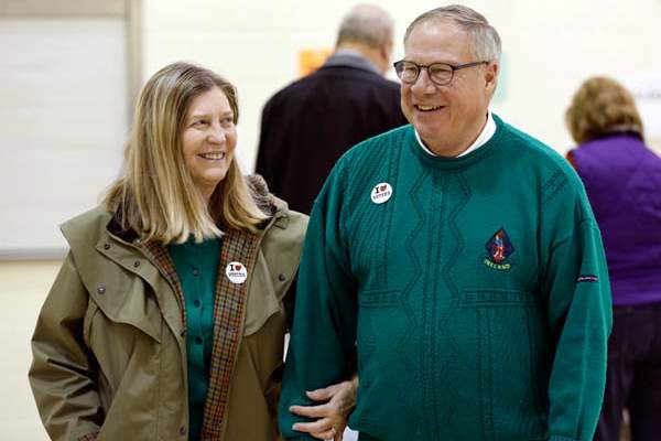 CTY collinsvotes06p Toledo mayoral candidate D. Michael Collins, right, and Sandra Drabik, his wife, wait to check-in to vote at the polling place at Church of the Cross on Cass Road, on election day, Tuesday, November 5, 2013. The Blade/Dave Zapotosky