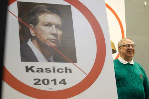 D. Michael Collins stands next to an anti-Kasich sign giving an acceptance speech.