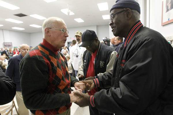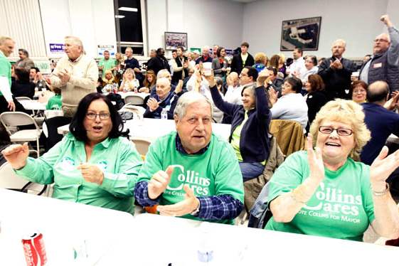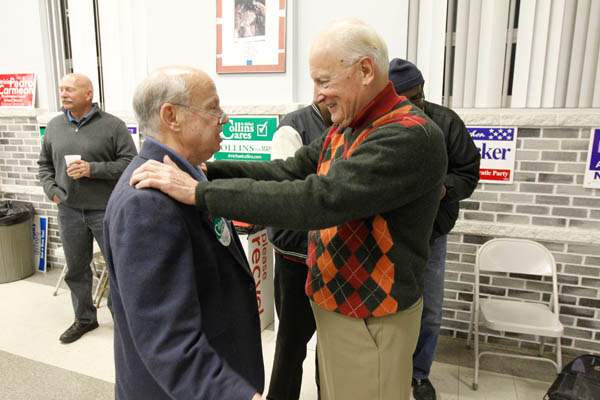 Former Mayor Carty Carty Finkbeiner speaks to former city councilman Art Jones, right, during the D. Michael Collins election viewing party.