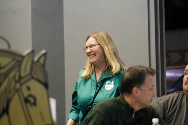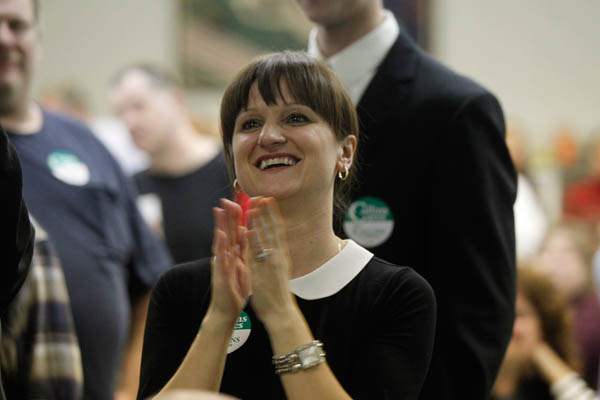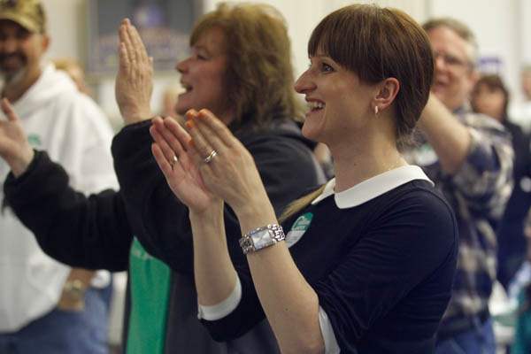 Supporter Lidia Ebersole applauds D. Michael Collins during his acceptance speech.