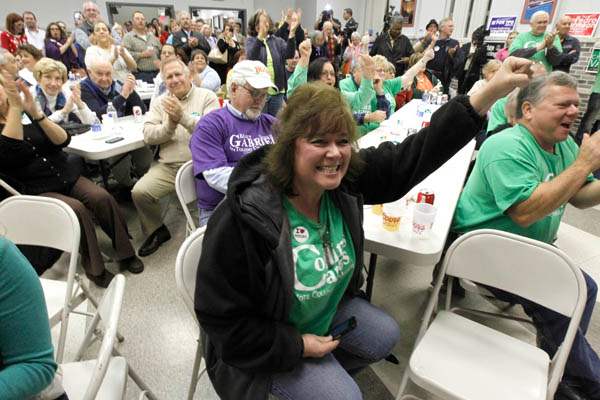 D. Michael Collins, left, and, Theresa M. Gabriel, right, react to elections during the viewing party.
