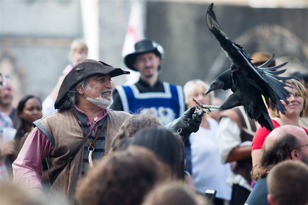 A member of Sky Kings Falconry leads a demonstration of different birds of prey including a black vulture.