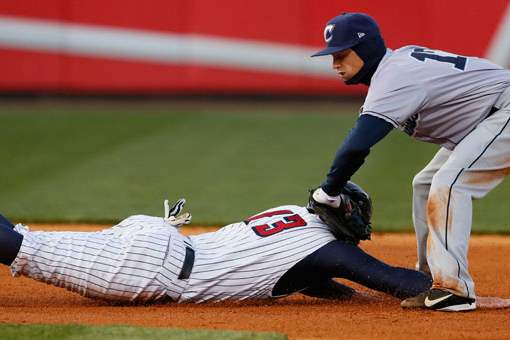 Ezequiel Carrera steals second base against Columbus Clippers second baseman Jose Ramirez.