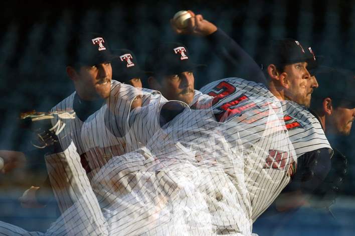 Mud Hens pitcher Drew VerHagen throws against the Columbus Clippers in this multiple exposure image.