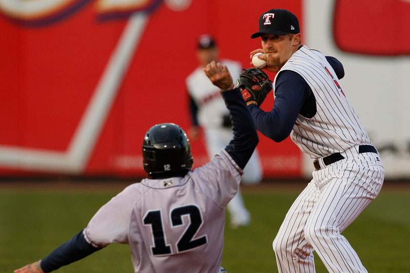 Second baseman Danny Worth turns a double play on Columbus Clippers SS Justin Sellers.