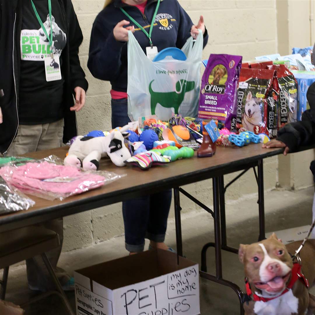 Volunteers Kari Smith, left, and Aimee Greenwald put together a bag of food and other items for Chico, 1, a male Red Nose 'pit bull' at bottom right.