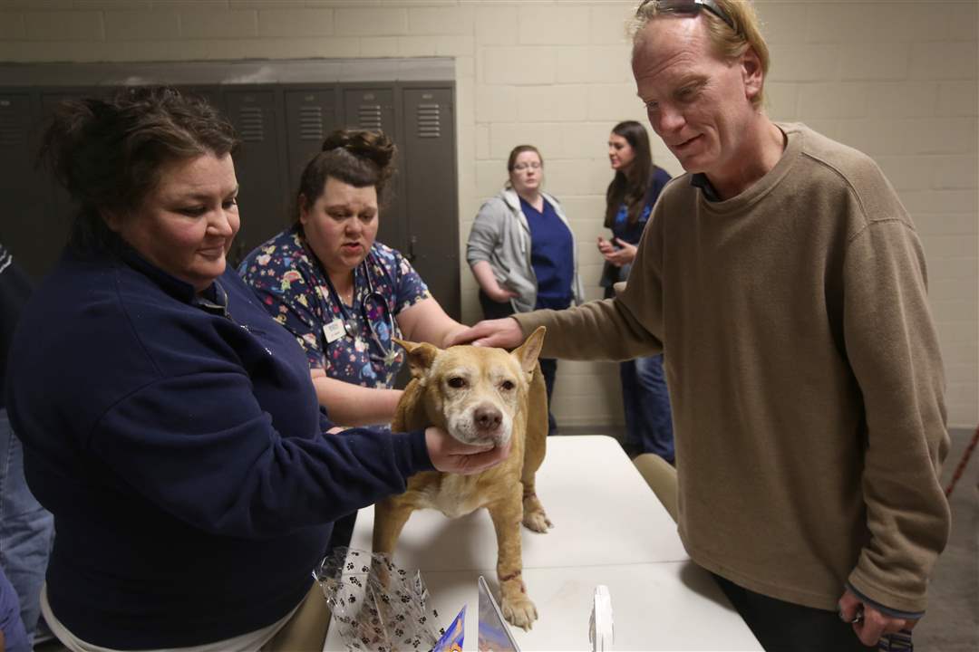 Sara Beam, a registered veterinary technician, left, and Dr. Monica Monto, center left, check Sienna, 14, a female 'pit bull' owned by Mark Mazurka, right.