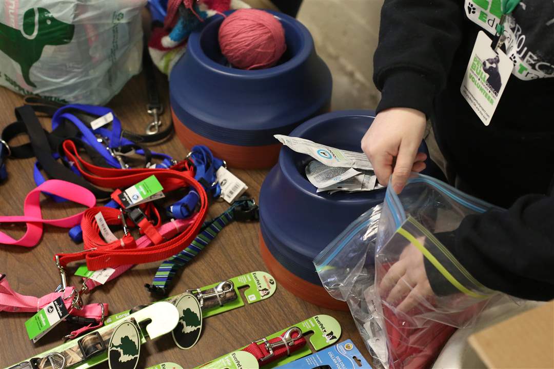 Volunteer Kari Smith puts together a bag of food and other items for Chico, 1, a male Red Nose 'pit bull.'
