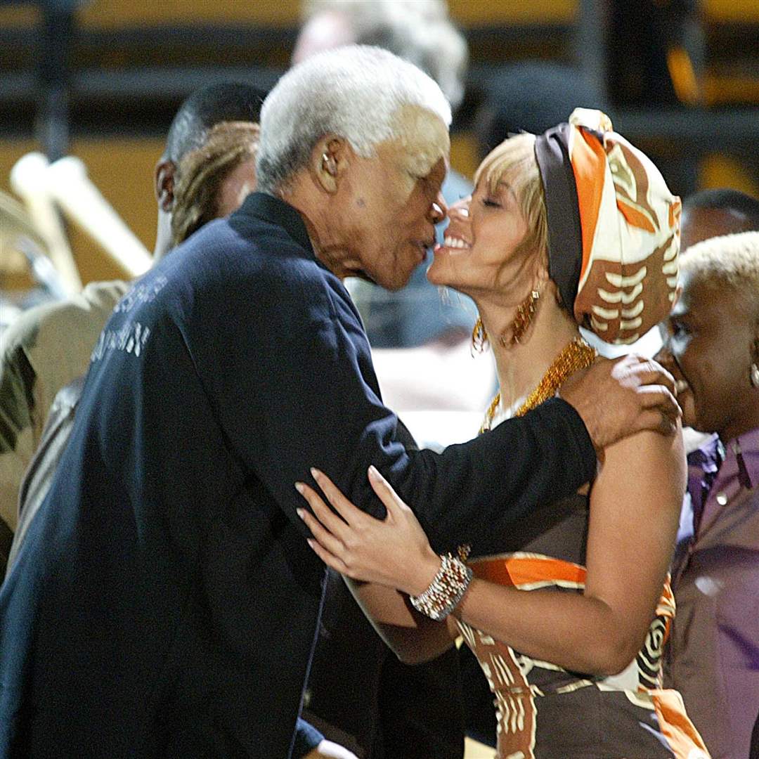 This Nov. 29, 2003 photo shows former South African President Nelson Mandela, left, kissing U.S. singer Beyonce Knowles, at the Nelson Mandela AIDS Benefit Concert in Cape Town, South Africa.