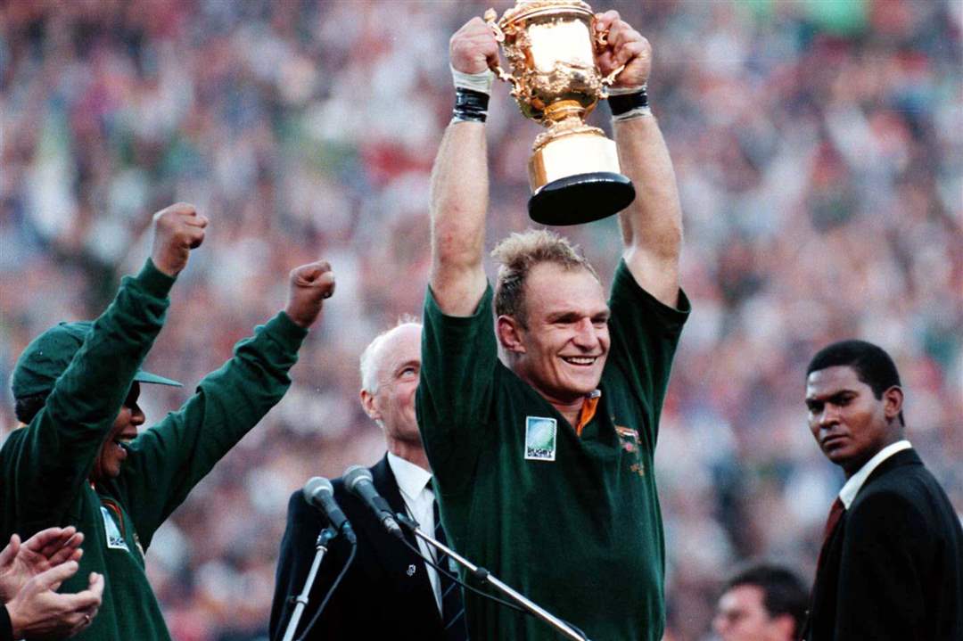 In this June 24, 1995, photo, South African rugby captain Francios Pienaar, center, raises the trophy after receiving it from South African President Nelson Mandela, left, who wears a South African rugby shirt, after they defeated New Zealand in the final 15-12 at Ellis Park, Johannesburg. Mandela strode onto the field wearing South African colors and bringing the overwhelmingly white crowd of more than 60,000 to its feet. They chanted "Nelson! Nelson! Nelson!" as Mandela congratulated the victorious home team in a moment that symbolized racial reconciliation.