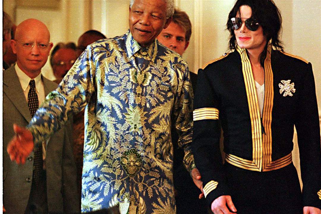 In this March 23, 1999 photo, South African President Nelson Mandela, left, stands with American pop singer Michael Jackson at a news conference in Cape Town where Jackson announced dates for two concerts in June of which profits will go to various funds including the Nelson Mandela Children's Fund.