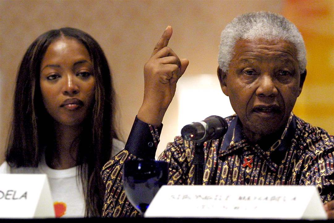 In this July 30, 2001 photo, former President of South Africa, Nelson Mandela, right, speaks during a press conference alongside British model Naomi Campbell in Barcelona, Spain, before the 'Frock and Roll' benefit concert to raise money for the Nelson Mandela Children's Fund.