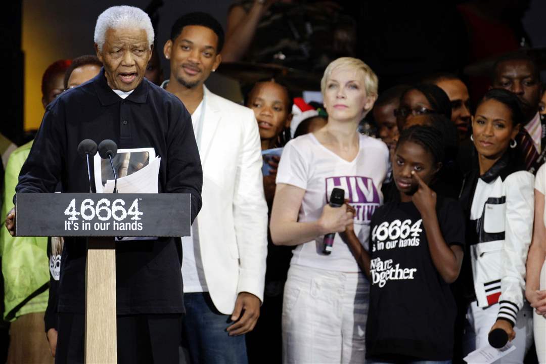 This June 27, 2008 photo shows Nelson Mandela, left, speaking as Will Smith, second from left, Annie Lennox, center, and Jada Pinket Smith, right, look on at the 46664 charity concert in honor of Mandela's upcoming 90th birthday in London.