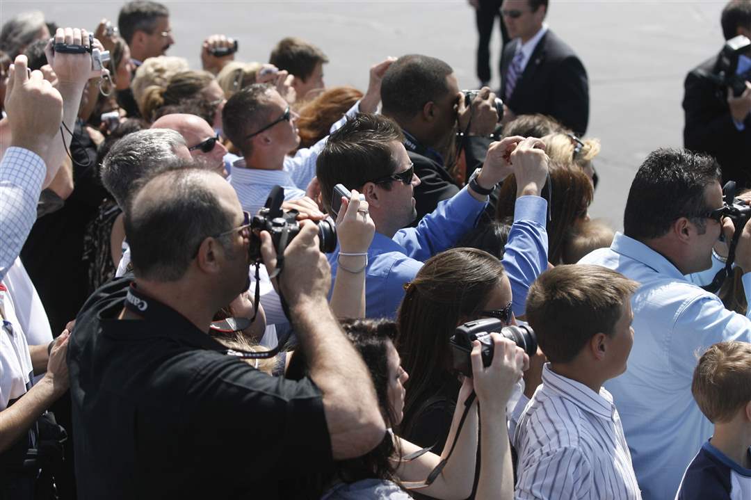 Crowd watches arrival of President Barack Obama at Toledo Express Airport.