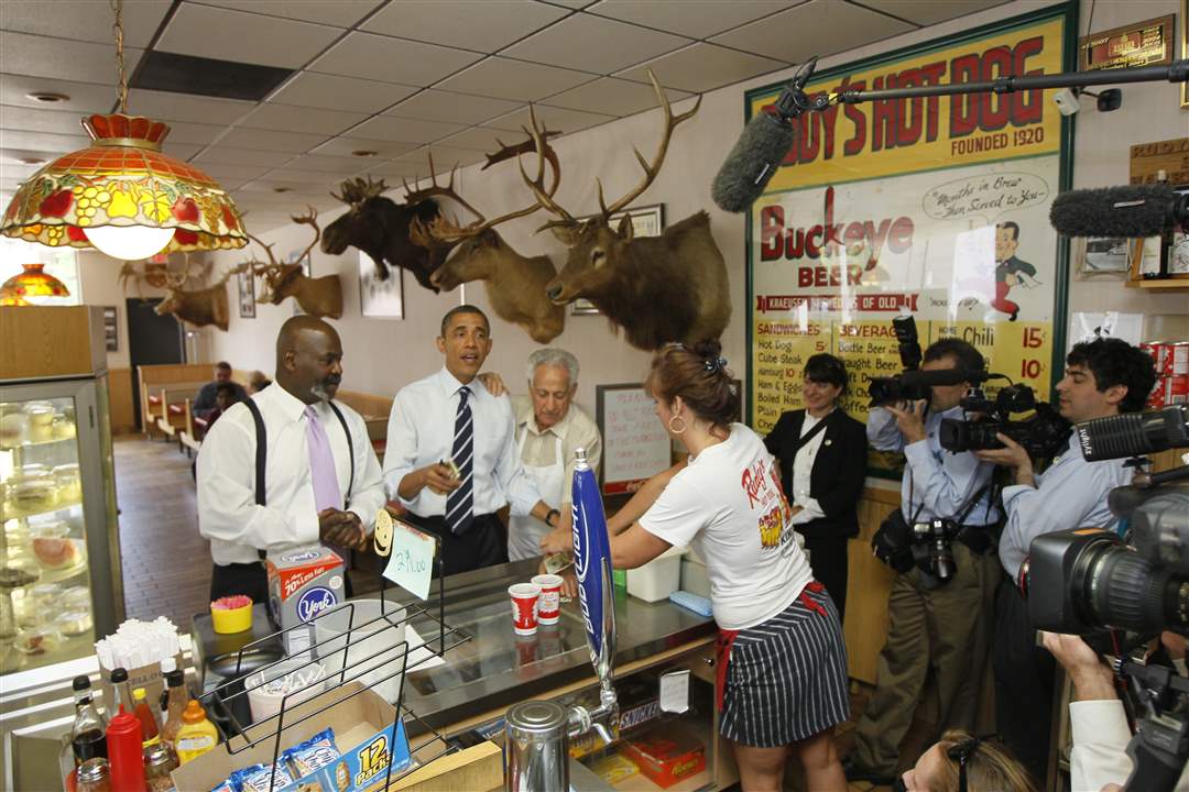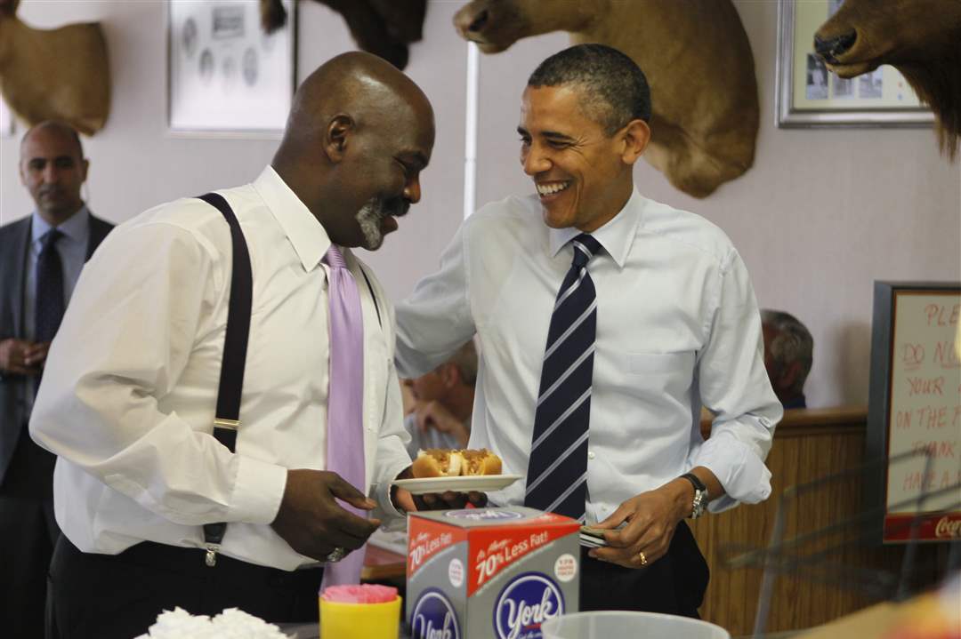 President Obama, right, and Toledo Mayor Mike Bell at Rudy's Hot Dogs.