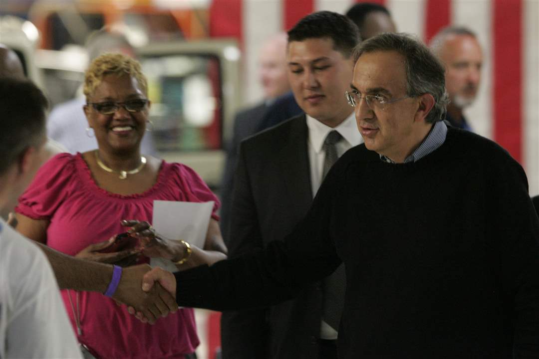 CEO Sergio Marchionne, CEO of Chrysler Group LLC, shakes hands with Jeep workers after President Obama's visit to the automaker's Toledo assembly complex.