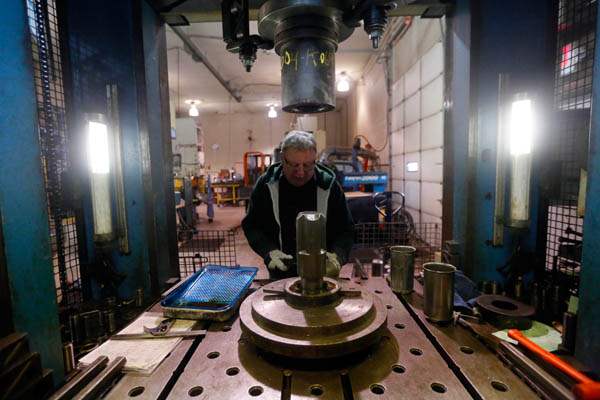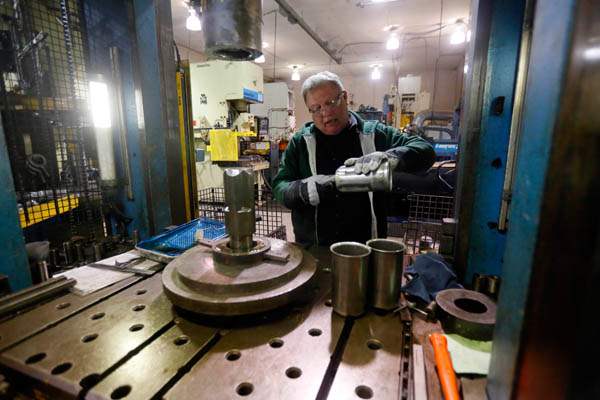 Daniel Tenney, an employee with Toledo Metal Spinning, works to make a steel blender cup.