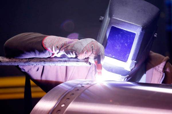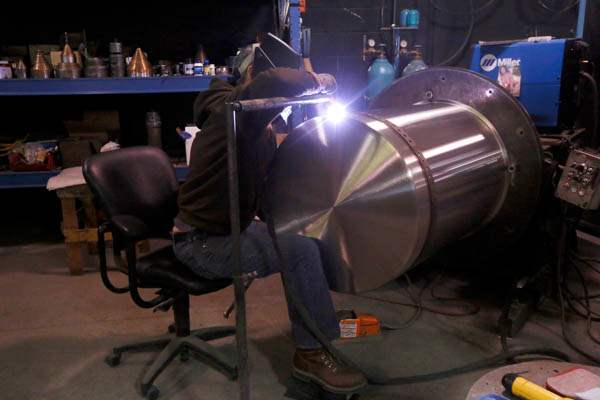 Mark Dusseau, an employee with Toledo Metal Spinning, works to make a steel beer fermentor.