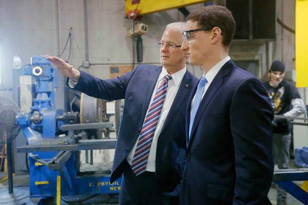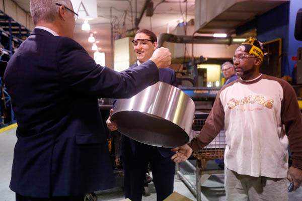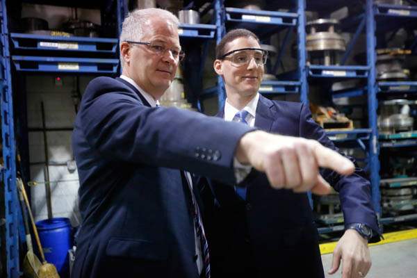 Eric Fankhauser, left, vice president of Toledo Metal Spinning gives Ohio Treasurer Josh Mandel, right, a tour.